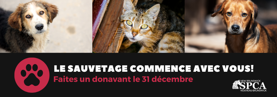Lorsque vous appuyez la SPCANB, vous offrez la chance d’un avenir meilleur aux animaux. Vos dons nous aident à enlever les animaux des situations dangereuses et à leur prodiguer les soins et l’amour qu’ils méritent jusqu’à ce qu’ils trouvent leur foyer pour toujours.